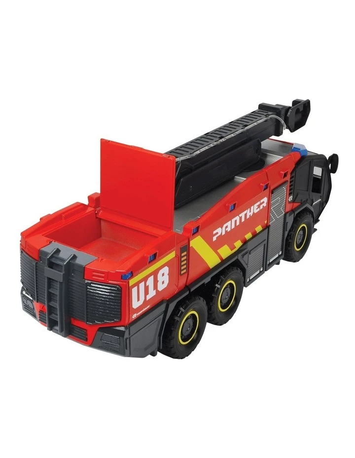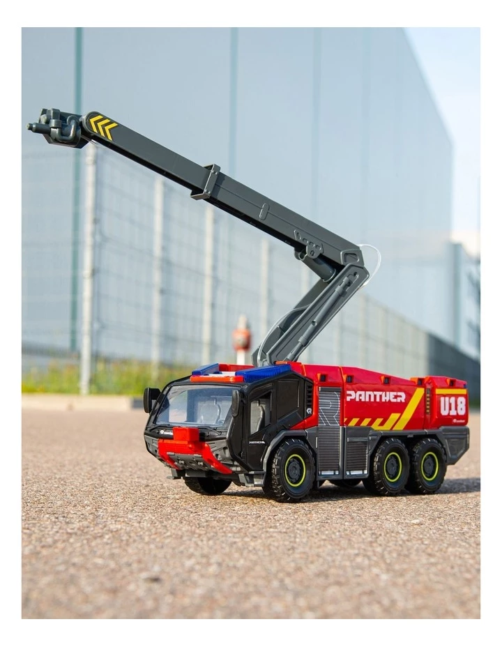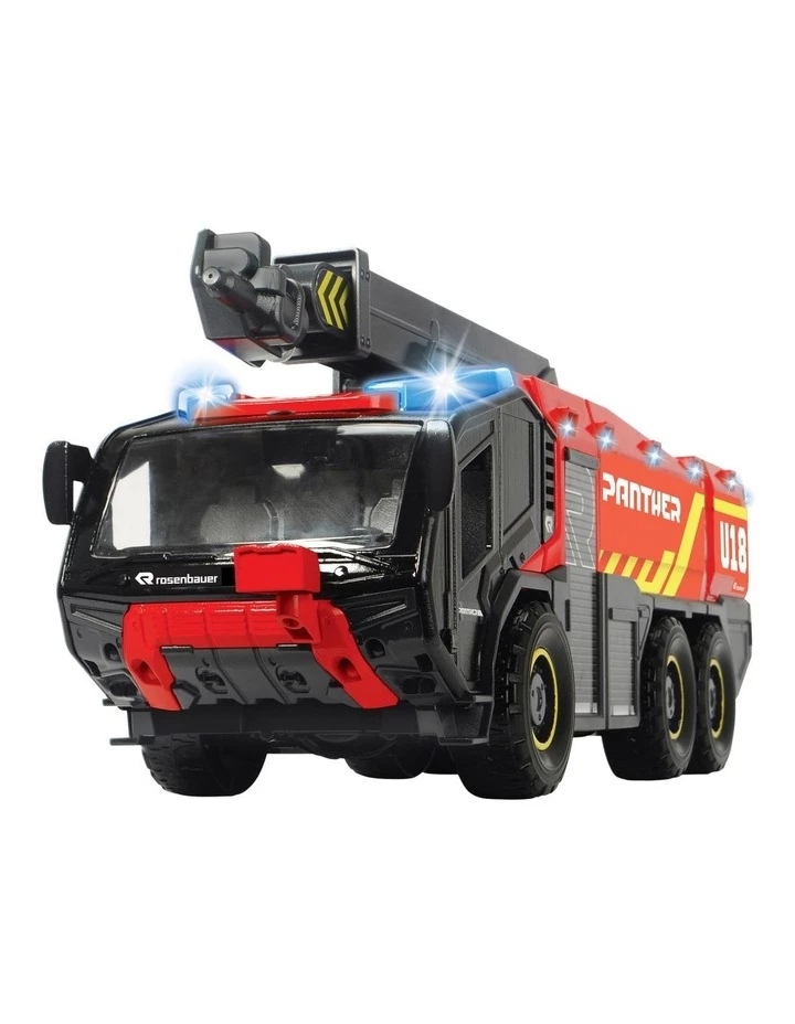 Always ready to spring into action. Here comes the fire brigade: What is the next adventure waiting for the team? The RC Airport Fire Brigade from Dickie Toys features a cool water spray function that is guaranteed to provide hours of endless fun for your little one. Whether its a building thats on fire or a cat that needs rescuing from a tree, the bravefiremen can be at the scene in no time in their speedy fire engine. The extendable arm allows the firemen to easily climb to inaccessible areas. The large Rosenbauer Panther 6×6 with a red fire brigade design can be moved in all directions via the 4-channel remote control. There are also a range of light and sound effects to bring the exciting features to life. The remote-controlled toy vehicle is an ideal gift for boys and girls aged three and above!