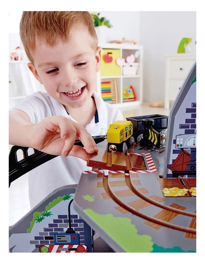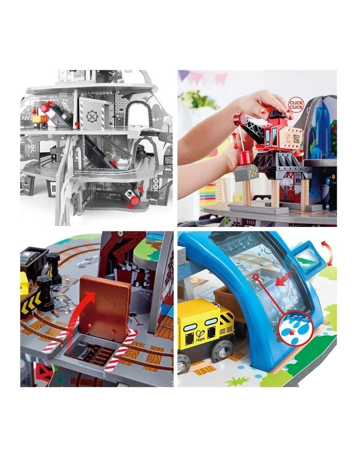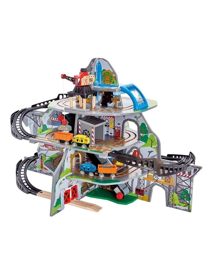 Drive your train from the surface of a mighty mountain into the busy mine operating deep inside! This fun playset includes a waterfall tunnel, an obstacle bridge, a crane, a conveyor belt and a repair station.