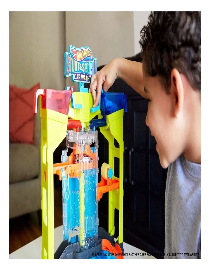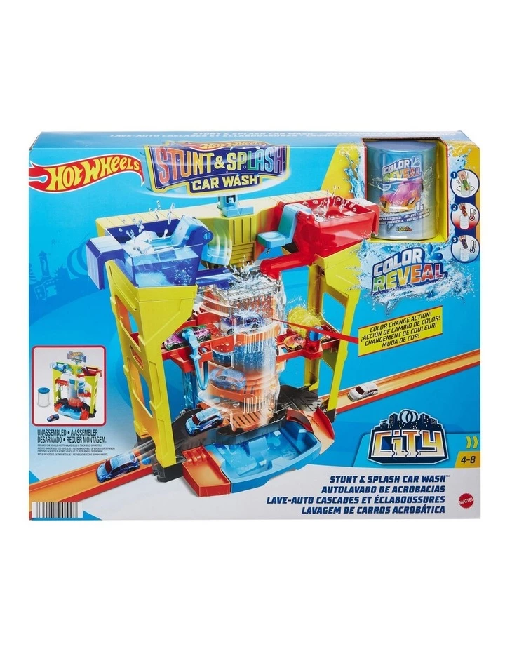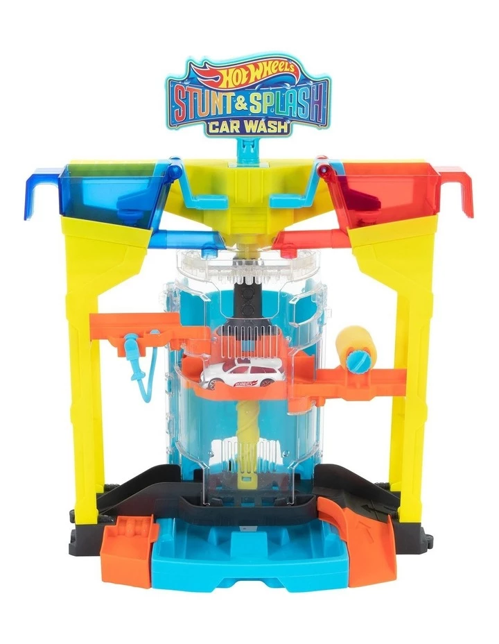 The Hot Wheels Stunt & Splash Car Wash playset combines practical elements of a real-life car wash with the action-packed world of Hot Wheels. Straight out of the box, discover the Colour Reveal car that’s covered in a specialised coating to kick off the adventures. Fill the included barrel with water, drop the car in, and swirl it around for the initial reveal: a cool Hot Wheels car with a totally sweet deco! Put the car into the hand-crank elevator that carries it through an intricate set-up leading to a rain-pipe where the car will shift its colours when cold water is released onto it. Release warm water and the car changes back! Alternate between the water temperatures to shift between the last two colour changes over and over again! The Hot Wheels Stunt & Splash Car Wash with Colour Reveal car connects to other Hot Wheels City track sets (sold separately) for adventures all over the city. Makes a great gift for kids ages four years old and up who will find hours of playtime thrills with this set. Colours and decorations may vary.