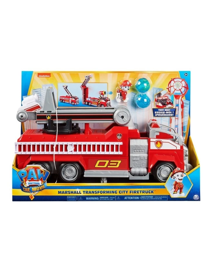 Bigger, bolder rescues call for the ultimate PAW Patrol rescue vehicle: Marshalls Transforming City Fire Truck! This incredible fire truck toy brings Marshalls truck from PAW Patrol: The Movie to life. Epic transformations, an extendable and rotating rescue ladder, massive water cannon launcher, flashing lights and realistic sounds make this PAW Patrol toy the perfect way to play out your movie-inspired rescues!