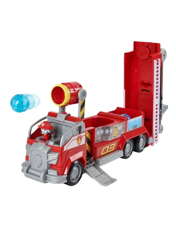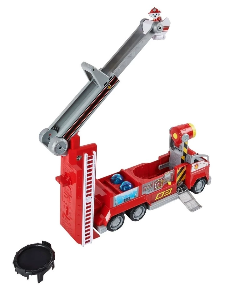 Load the included Marshall action figure and another pup from your collection (additional PAW Patrol figures sold separately) into the cab and race to the rescue. Roll up to the scene and transform Marshalls truck by pulling back the top. Unable to reach the top of the building? Its no problem for the ladder its taller than the ladders on previous PAW Patrol vehicles! Rotate it 360 degrees and extend it to reach the tallest city buildings! Press the button on top of the fire engine for lights and exciting sound effects! Slide your friend in trouble down the ladder to safety, landing on the trampoline rescue net, then use the water cannon launcher to put out fires and take down obstacles. Push the button on the inside of the truck to make the launcher pop up! Load a projectile (two included) and press the button on the back to launch and save the day! For even more ways to play, this toy truck even has two detachable ladders to use in your adventures.