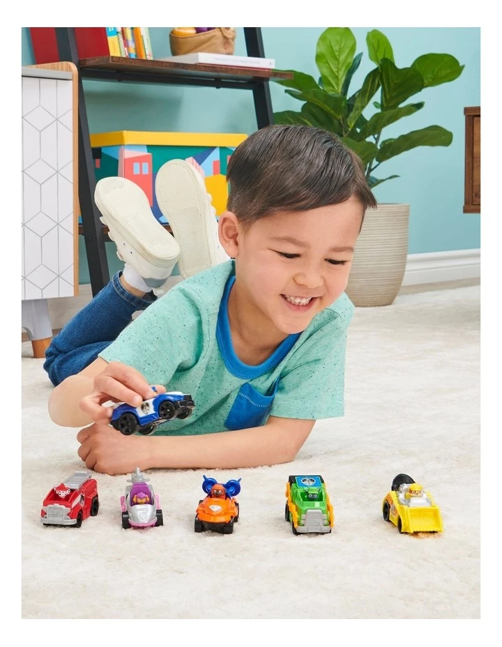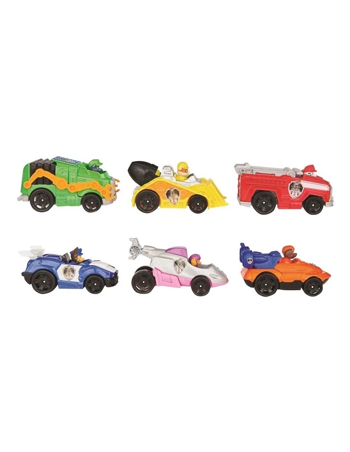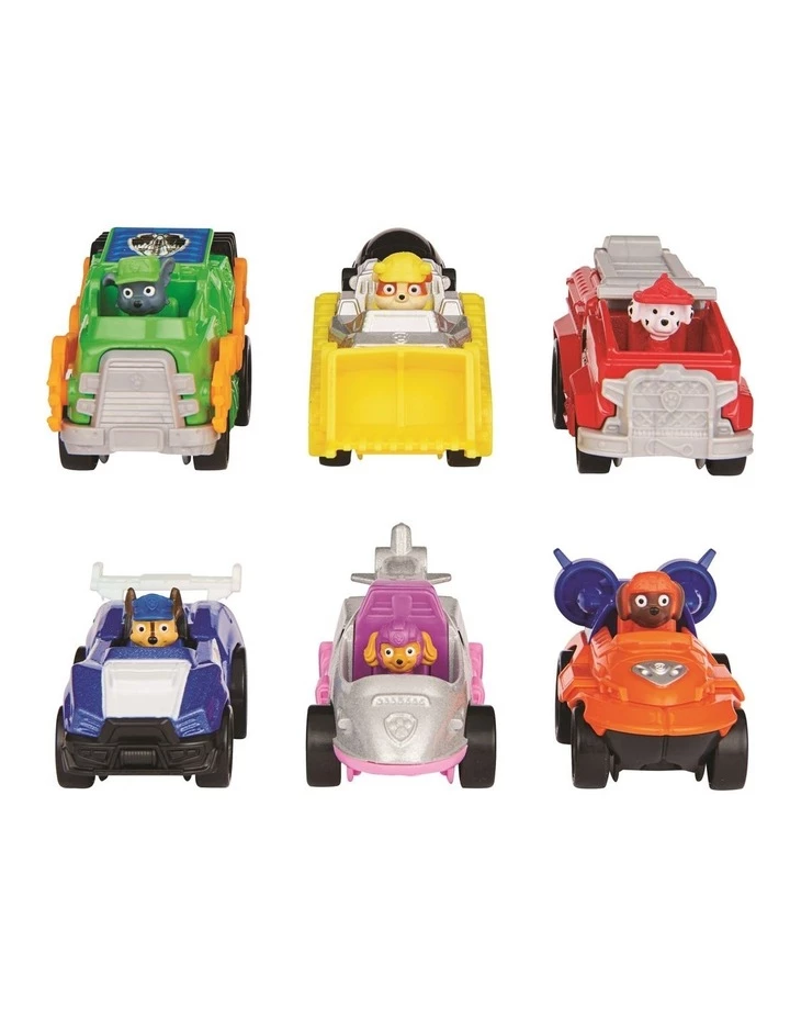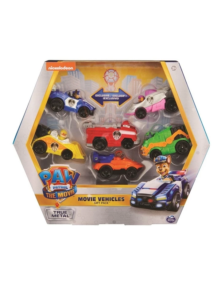 PAW Patrol are ready to race to the rescue faster than ever before in their PAW Patrol: The Movie True Metal vehicles! The Movie Vehicles Gift Pack comes with six 1:55 scale metal vehicles, including exclusive metallic versions of Chase and Skyes vehicles you wont find anywhere else! Featuring authentic movie details and graphics, real working wheels and metal die-cast material, the True Metal vehicles look just like the PAW Patrols sleek city vehicles from the big screen! Push the vehicles by hand or launch them forward for high-speed adventures inspired by the movie! Each pup is moulded inside their vehicle with ears flopping back in the wind, racing to the rescue!