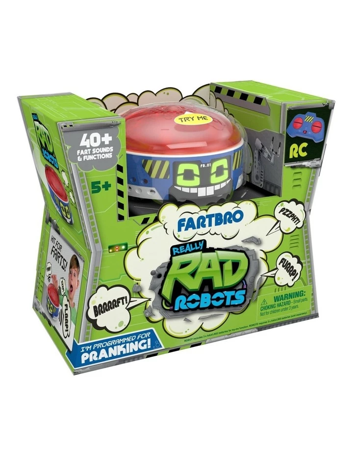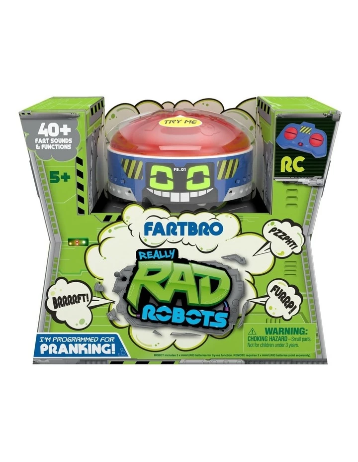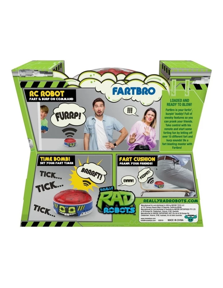 Fartbro is the remote controlled robot made for pranking! Team up with Fartbro and go on some sneaky ‘Fart Blasting’ missions! This fun filled robot has over 15 burp and fart sounds to let off! There are so many ways to launch a sneaky "Fart attack" with Fartbro! Place him in ‘Stealth Mode’ and silently drive him into a room to find an unsuspecting victim. Then remotely let him rip at the most inappropriate moment! AWKWARD! Fartbro can also be used as the ultimate fart cushion! Place him on a chair. When your friends sit on him, he lets one rip! This Robot is a real little mover! Not only can you control him through his remote, but he can also go into ‘Dance Mode’ and break out some really rad dance moves! With Fartbro you can become a ‘Fart Blaster’ Master!